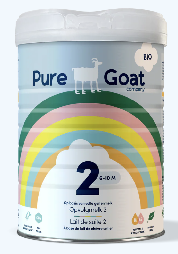 Pure Goat Company’s opvolgmelk 2 met van nature aanwezig melkvet en A2 melk uit biologische volle geitenmelk. Geschikt voor baby’s van 6 tot 10 maanden